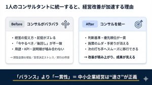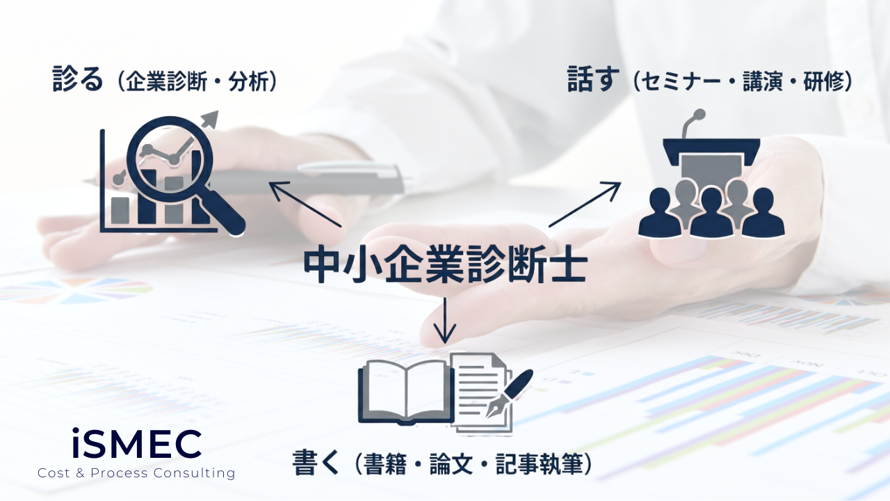 このたびは当サイトをご覧いただき、ありがとうございます。中小企業診断士として、経営理論に基づいた経営改善・業務効率化・DX推進の支援を行っています。体系的な理論を土台に、現実の経営に適用できる形へ落とし込みながら、経営者の意思決定を伴走型でサポートしています。何から手を付ければよいかわからない段階からでも、安心してご相談ください。