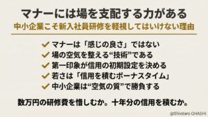 ただし、どちらの事例にも共通する注意点があります。先代は助けたい、後継者も助かる——その善意は、一瞬で「口出し」に化けます。値付けに口を出す、人事に口を出す、取引先に「昔はこうだった」と言ってしまう。いつの間にか決裁の一部になってしまう。こうなると後継者の自走が止まります。だから大切なのは、残り方の設計です。支援する工程を限定する、時間を限定する、期限を設ける。この三つを最初に合意しておくだけで、先代の存在は「安定装置」になります。境界線のない支援は二重権力に戻り、境界線のある支援は後継者の成長を加速させる。「俺はまだ役に立てる。でも、決めるのはあいつだ。だから気が楽だ」——このバランスが、承継を前に進めます。
