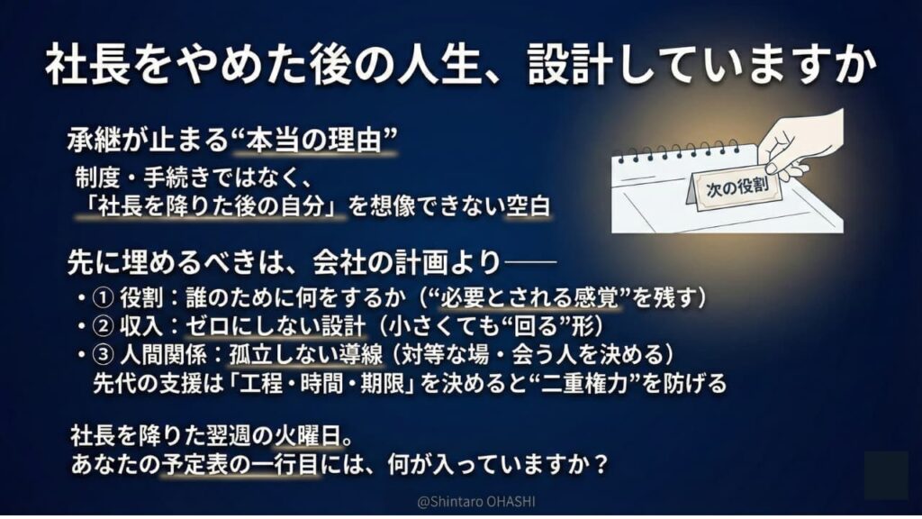 最終的に足を止めているのは、たいていの場合、制度や手続きではありません。「社長をやめた後の自分を、具体的に想像できない」という、ある種の空白です。この空白は契約書にも決算書にも出てきませんが、最後の最後で人を止めます。だから今回は、制度の話ではなく、そこを扱おうと思います。