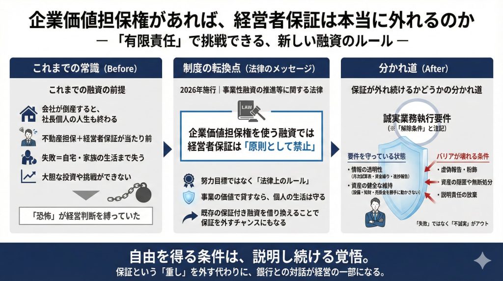 しかし、2026年5月に施行される「事業性融資の推進等に関する法律」は、この長年の前提を大きく揺さぶります。今回は、経営者が最も気にしているであろう問い、「企業価値担保権を使えば、本当に個人保証(経営者保証)は外れるのか」という核心について、制度と実務の両面から整理します。
