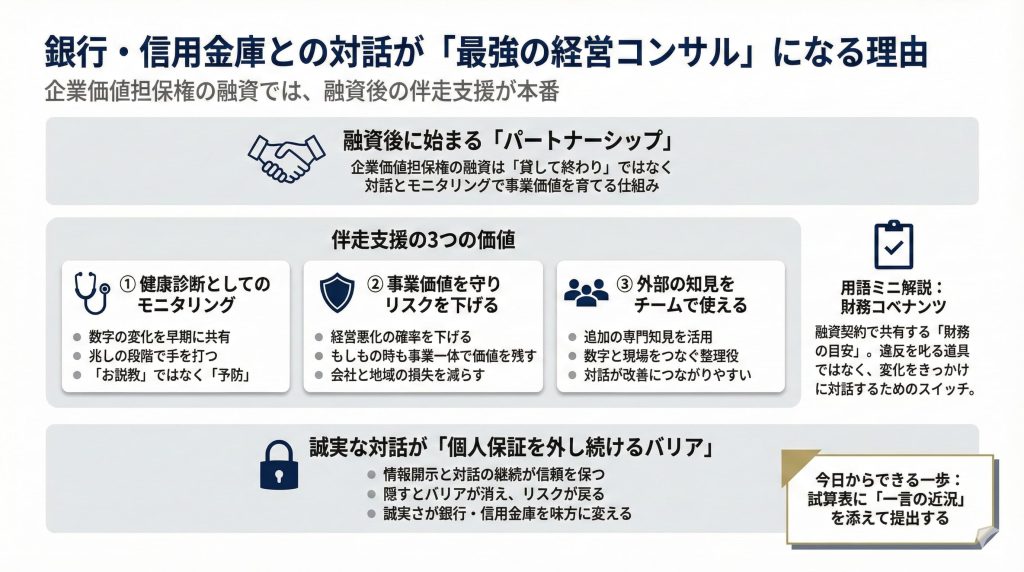 定期的なモニタリングに応じ、良いことも悪いことも共有する。その行為自体が、個人保証を行使させないためのバリアになります。