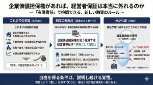経営者が本来向き合うべき「事業そのもの」に集中できる環境を整える。そのための選択肢として、企業価値担保権と伴走支援を知っていただければと思います。