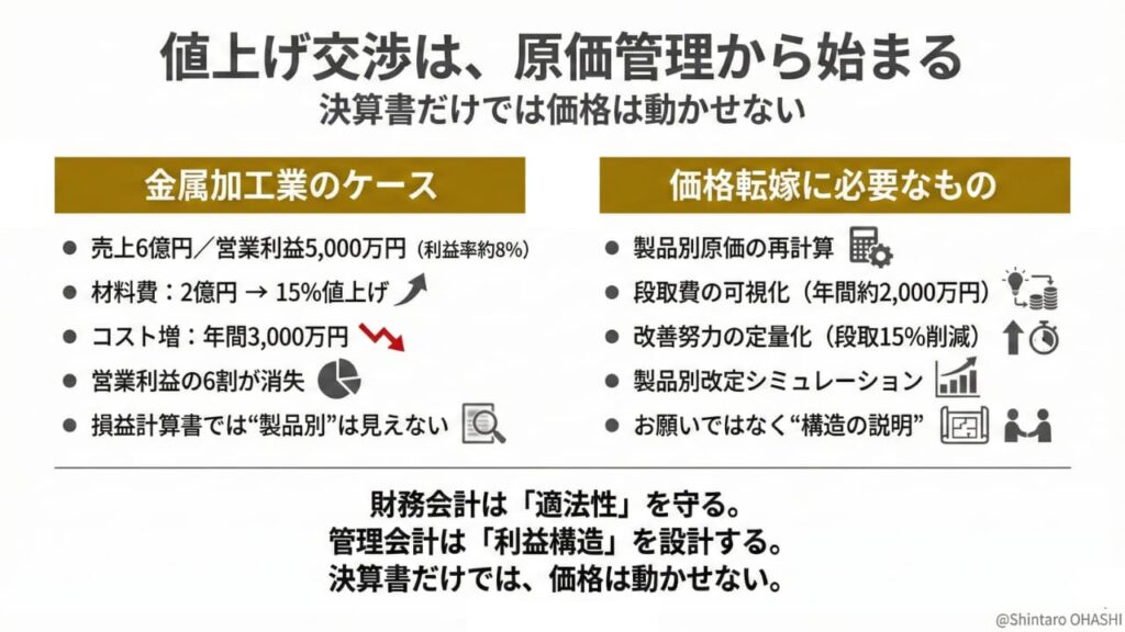 ただ、「材料費が上がった。さて、どうする?」という局面で求められるのは、決算書を正しく作る能力ではなく、原価を分解して利益構造を再設計する能力のほうなんですね。使う道具が違うのですから、使い手も違ってきます。ただそれだけの話なのですが、実際にはこの違いが意識されていないケースがとても多いんです。「税理士の先生に全部お任せしているから大丈夫」という中小企業の社長は少なくありませんが、価格転嫁という攻めの課題は、守りの専門家だけでは対処しきれないのです。