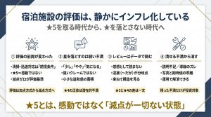宿泊事業者の方から相談を受けていると、ここ数年で明らかな変化を感じます。それは、「★5を取るための条件」が、以前とはまったく違うものになってきている、という点です。 少し前までであれば、ホスト対応が良いというだけで、十分 […]