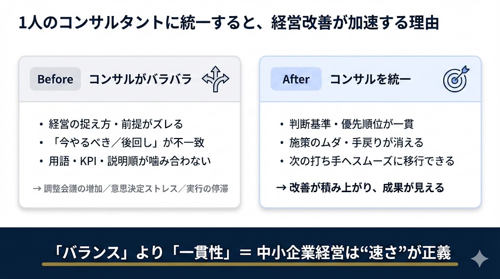 もっとも、複数の専門家が関わる体制が、すべてうまくいかないわけではありません。指揮命令系統が明確で、全体を見渡すメインのチーフ・コンサルタントがいて、情報がそこに集約されるチームとして機能している場合には、比較的うまく回ることもあります。ただし、この体制を整えるには、それなりのコストもかかります。多くの中小企業にとって、再現性の高い方法とは言いにくいのが現実です。