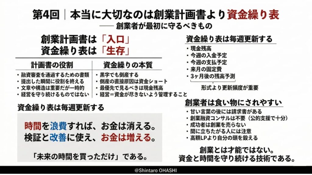 4回にわたりお読みいただきありがとうございました。創業とは才能の問題ではありません。資金と時間を守り続ける技術です。現場で、生き残ってください。