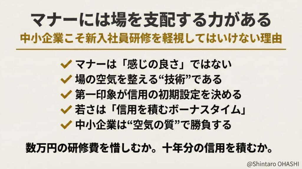 しかし、私はあえて強く言いたい。マナーには場を支配する力があります。そしてその力を体系的に学べる機会は、新入社員のときしかほとんどありません。これは単なる礼儀の話ではなく、経営の話です。