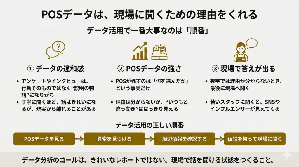 「この週だけ急に売れている」「この曜日だけ構成比が変わっている」。こうした違和感こそが、問いの種になります。実際の現場でも、ある小売店で平日の水曜日に特定の商品だけが不自然に売れていたことがありました。価格を変えたわけでも、店内施策を打ったわけでも、天候要因でも説明できない。統計モデルにかけると「いつもと違う動き」ははっきり出るのですが、理由はわかりません。テレビCMもチラシもなく、経営側が把握している範囲では「売れる理由が見当たらない」という結論になります。しかしPOSデータは、その異変を数字として示してくれました。それだけで十分な価値があります。数字と現場の間にはズレがある——そのズレを認識することが、次のステップへの入口なのです。