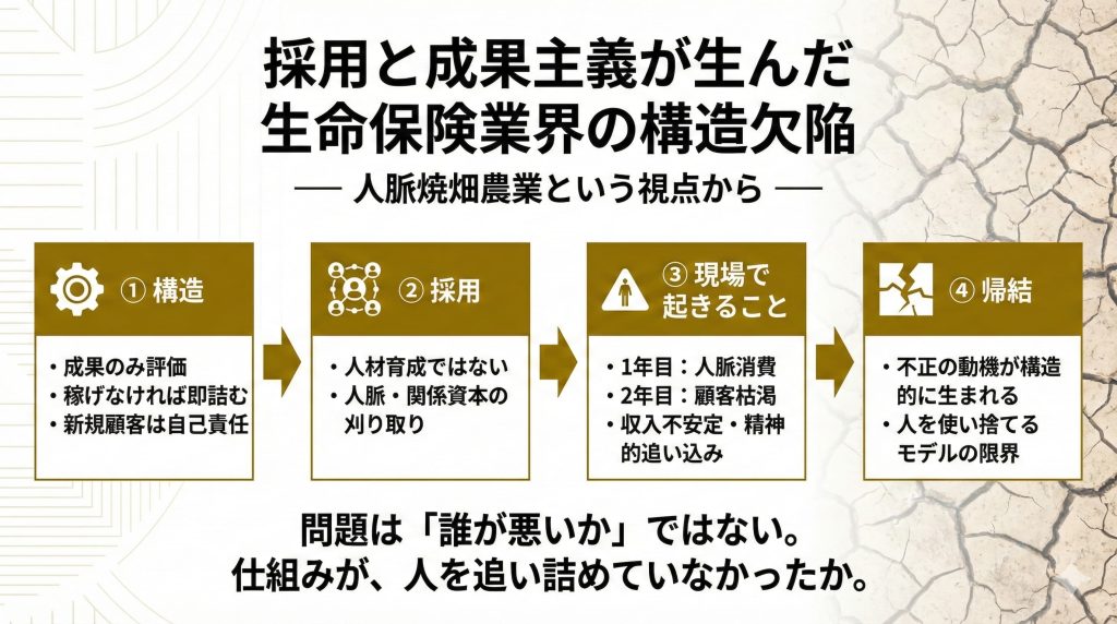 今回の不祥事が示しているのは、営業をプロとして育てる設計ではなく、彼らが持つ人間関係を換金し、枯れたら次を採るという人材焼畑農業型経営の限界です。採用を止めれば売上が止まるため、採用そのものがKPIになり続ける。しかし、刈り取れる人脈には必ず限界があります。この前提にメスを入れない限り、同じ問題は形を変えて、必ず繰り返されるでしょう。