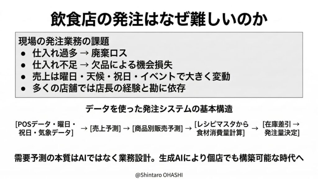 飲食店の発注管理は長年「経験と勘」に依存してきました。しかしPOSデータや気象データ、カレンダー情報を組み合わせることで、需要予測はかなりの精度で行えるようになっています。そして生成AIの登場によって、こうした仕組みを自社で構築するハードルも確実に下がっています。