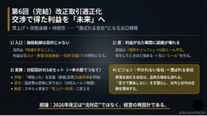そして次回(第6回・完結編)では、交渉で確保した利益を、賃上げ・人事評価・ビジョンへどうつなげるか——“稼ぐ”を“強い会社づくり”に変える話をします。価格転嫁はゴールではなく、経営の再設計の入口です。