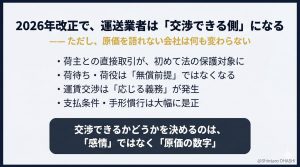 最初に、あえて厳しめに言います。今回の法改正は、値上げを保証してくれる“魔法の杖”ではありません。整備されたのは、協議をしやすくする環境です。門前払いが起きにくくなり、説明なしの一方的な代金決定は問題にされやすくなる。そこまでは確かに前進です。