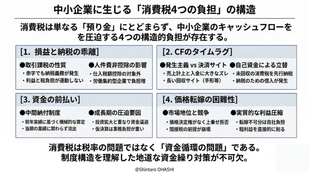 本稿では、消費税の税率の是非や政治的な賛否には立ち入りません。あくまで「制度の仕組み」と「企業財務の構造」という視点から、中小企業にとって消費税がなぜ資金繰りを圧迫する税として作用しうるのかを、4つの負担に分けて整理します。目的は、消費税を取り巻く問題を「税務の話」としてではなく、「キャッシュフローと資金循環の問題」として捉え直すことにあります。